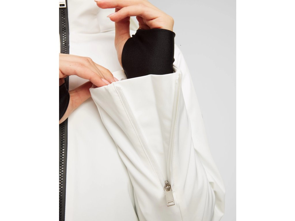 - mezi praktické prvky patří boční ventilace s krytými zipy, vnitřní elastické manžety na rukávech a obousměrný hlavní zip